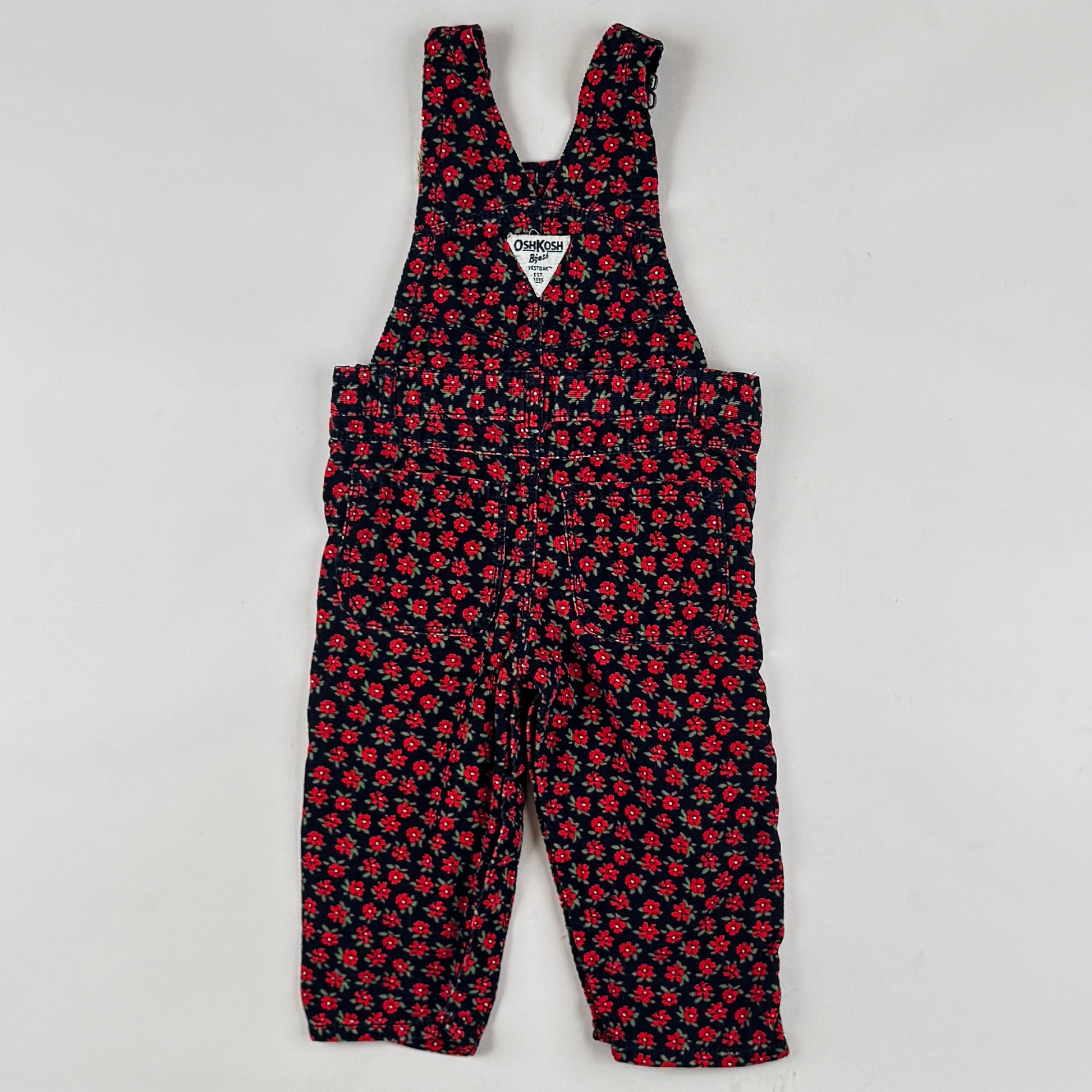 Cutest floral corduroy overalls from OshKosh in size 18 mo. The would probably also be a great fit for size 80, so please see the measurements to ensure the right fit. The overalls are in great quality and condition.