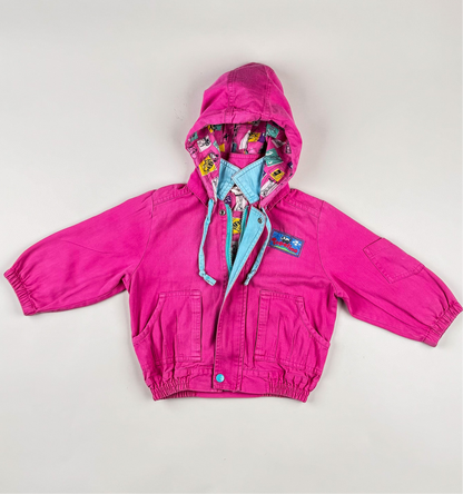 Coolest vintage jacket in size 92 with removeable hoodie. The jacket is perfect for summer as well as fall and spring with a sweater underneath. The jacket is lined with a colorful fabric and in very good condition.