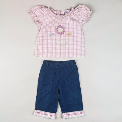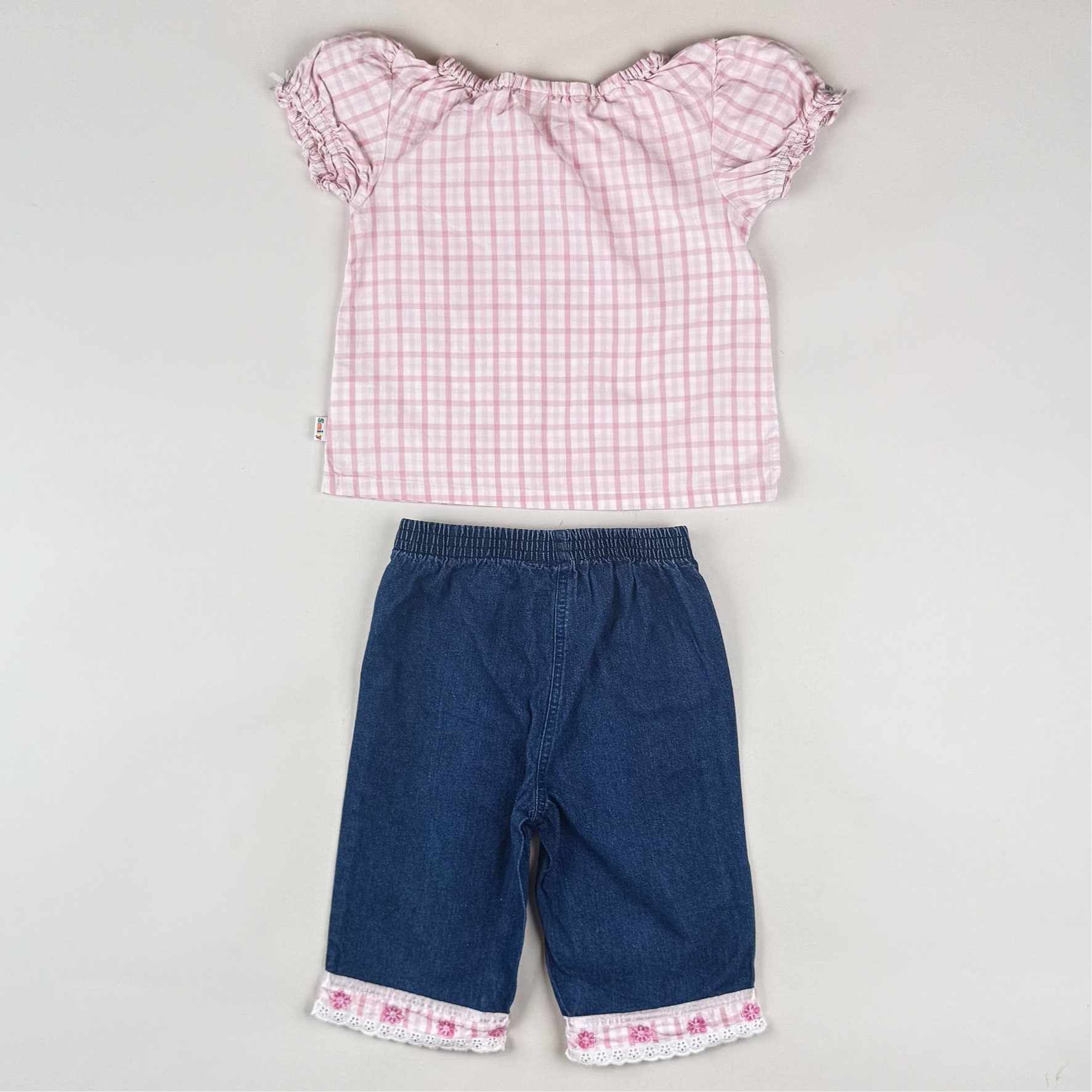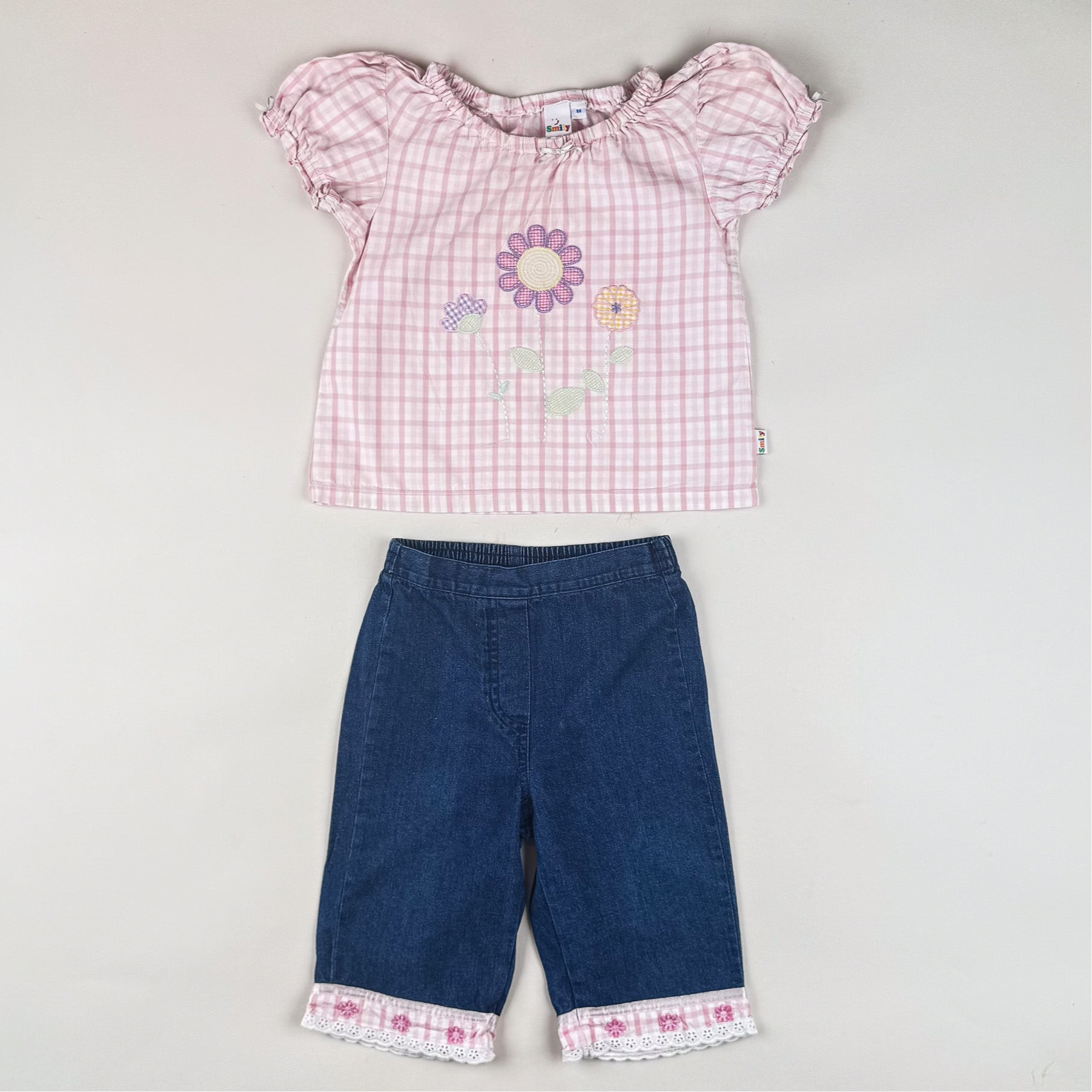 Cutest set in size 98. The measurements of the top are listed below, and the measurements of the pants are as follows; length 42 and waist 24 cm. The set is in great quality and condition, however, there are some discoloration on the neckline of the shirt that we have not attempted to remove. Please see the pictures and use the zoom function to have a closer look.