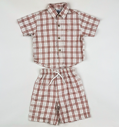 Cutest checked vintage set in size 18-23 mo. The set is in great condition, and the shirt's measurements are listed here on the page, but the pants' measurements are as follows: The length of the pant legs is 33 cm, and the waist width is 22 cm.