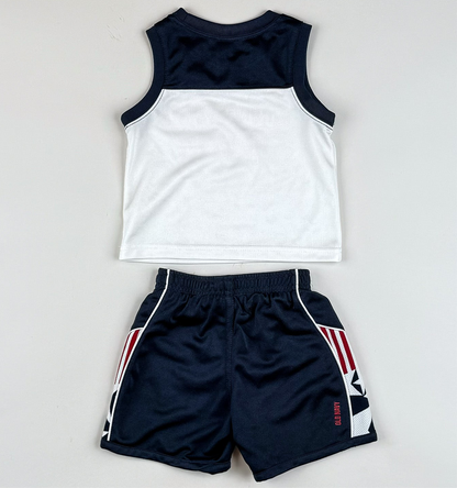 The coolest set from Old Navy in size 6-12 mo. The logo on the chest shows signs of wear, but it's still a really cool set. The tops measurements are listed here on the page, but the shorts measurements are as folows: The length of the shorts is 25 cm, and the waist width is 22 cm.