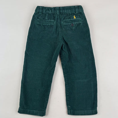 Coolest green corduroy pants from Ralph Lauren in size 3T. The pants have an adjustable waistband and are in great quality and condition, however, they have a tiny spot with discoloration on the back of the right pant leg all the way at the bottom. Please use the zoom function to have a closer look.