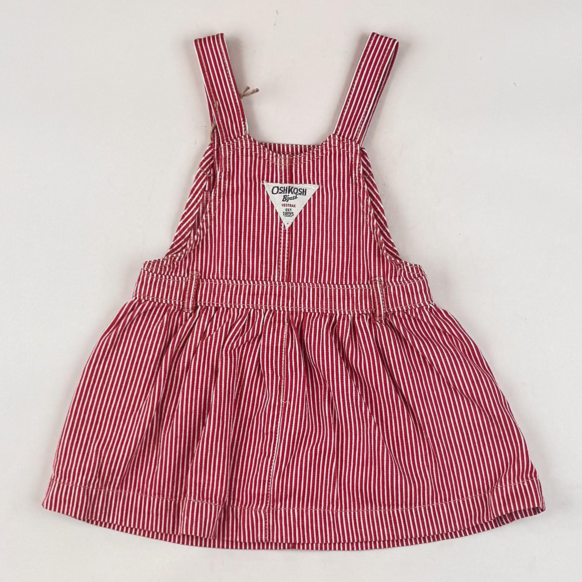 Coolest red hickory striped denim dress from OshKosh in size 3 yrs, however, we believe it would be a better fit for size 92. The dress is in great quality and condition.
