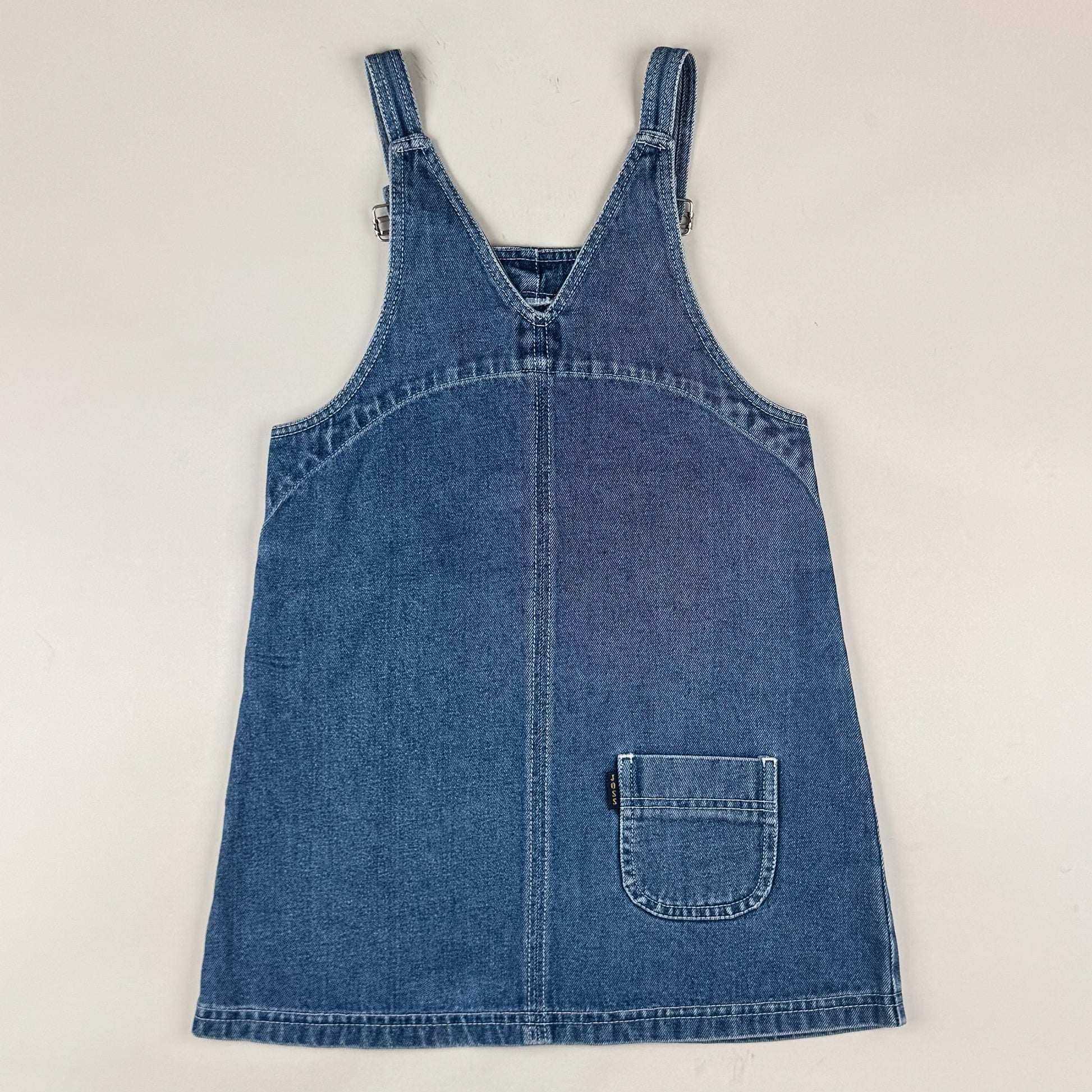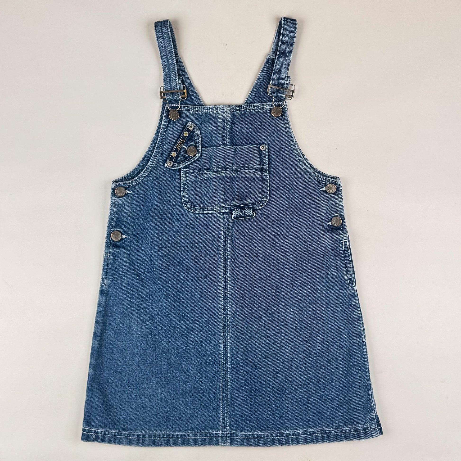 Coolest vintage denim dress in size 134, but we believe it would be a better fit for size 122/128. Please see the measurements to ensure the right fit. The dress is in great quality and condition.