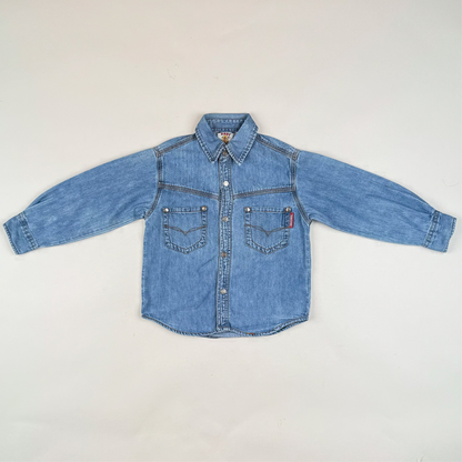 Coolest vintage denim shirt in size 98. There is no label in the shirt so please see the measurements. The shirt is in great condition and quality.