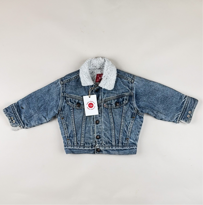 Coolest orange tab vintage cowboy jacket from Levi's in size 3T, however, we believe it would be a better fit for size 92. Please see the measurements to ensure the right fit. The jacket is lined with pile fleece and in great quality and vintage condition with only minor signs of wear that we have not attempted to remove. Please see the pictures and use the zoom function to have a closer look.