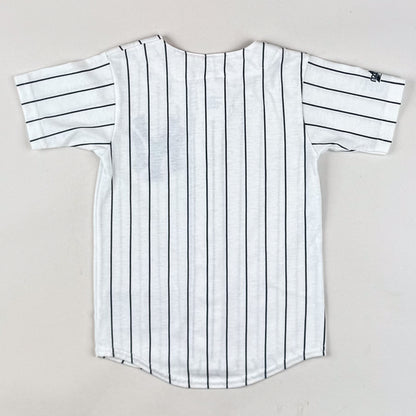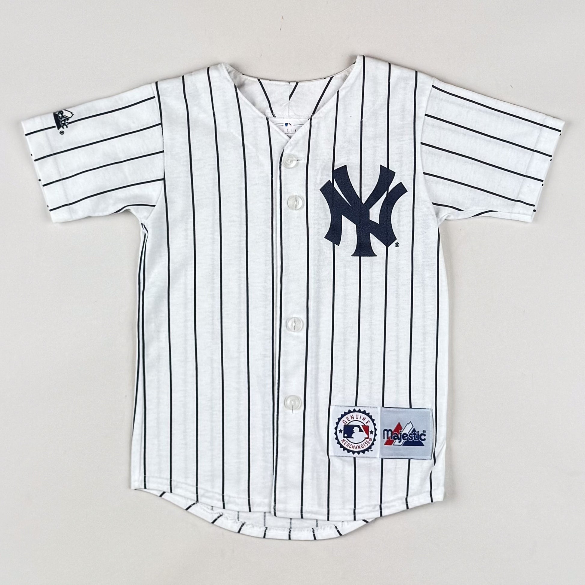 Coolest vintage MLB New York Yankees baseball jersey in size S youth, which we believe would be a great fit for size 98. It can easily be worn by smaller sizes with an oversize fit. The jersey is in great condition, but there is a tiny stain right next to the neckline. We have not attempted to remove the stain as it is barely noticeable, but please see the pictures to have a closer look.
