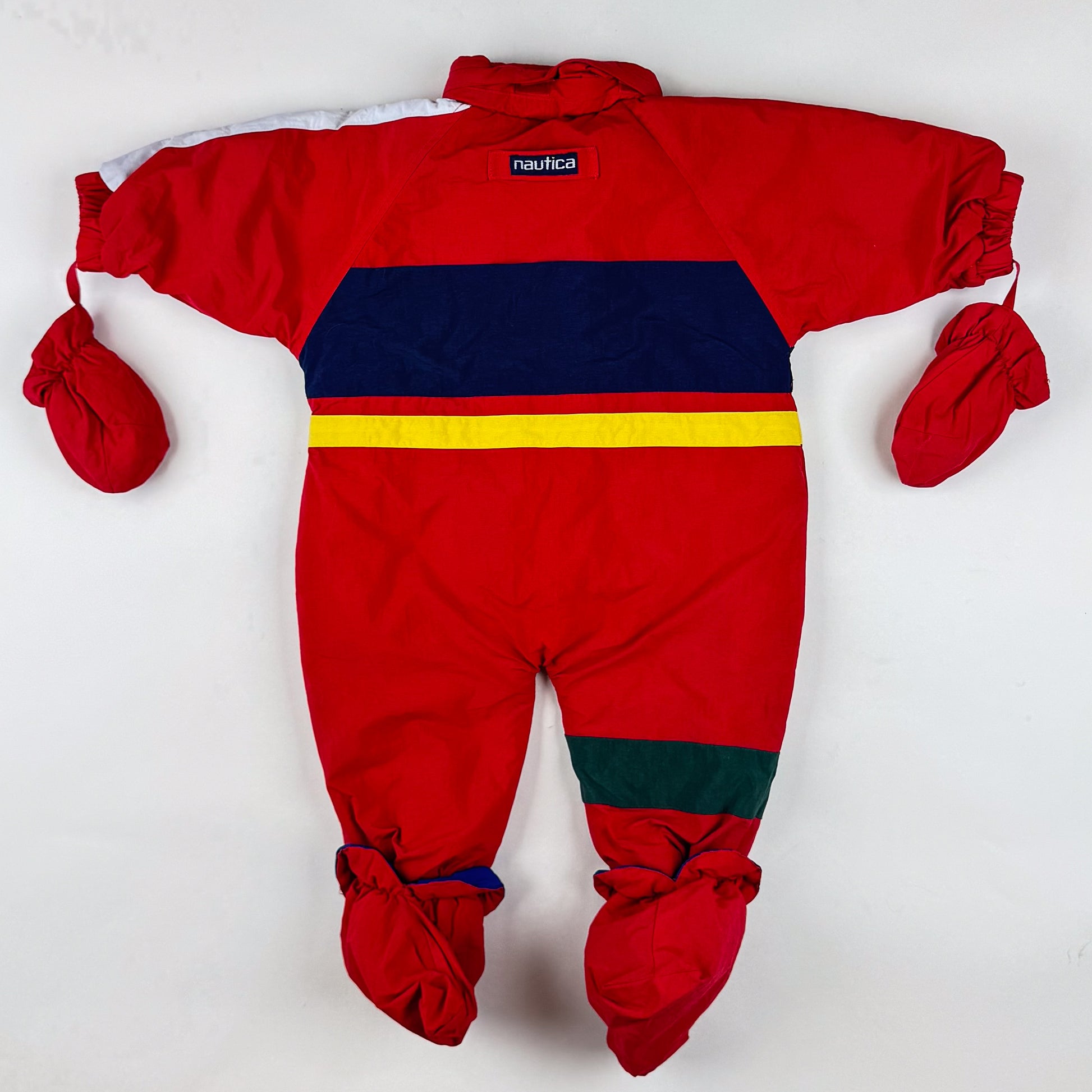 Coolest vintage snowsuit from the American brand Nautica in size 6-12 mo, however, we believe it would be a great fit for size 74. Please see the measurements to ensure the right fit. The snowsuit comes with gloves and footies and are in great quality and condition.