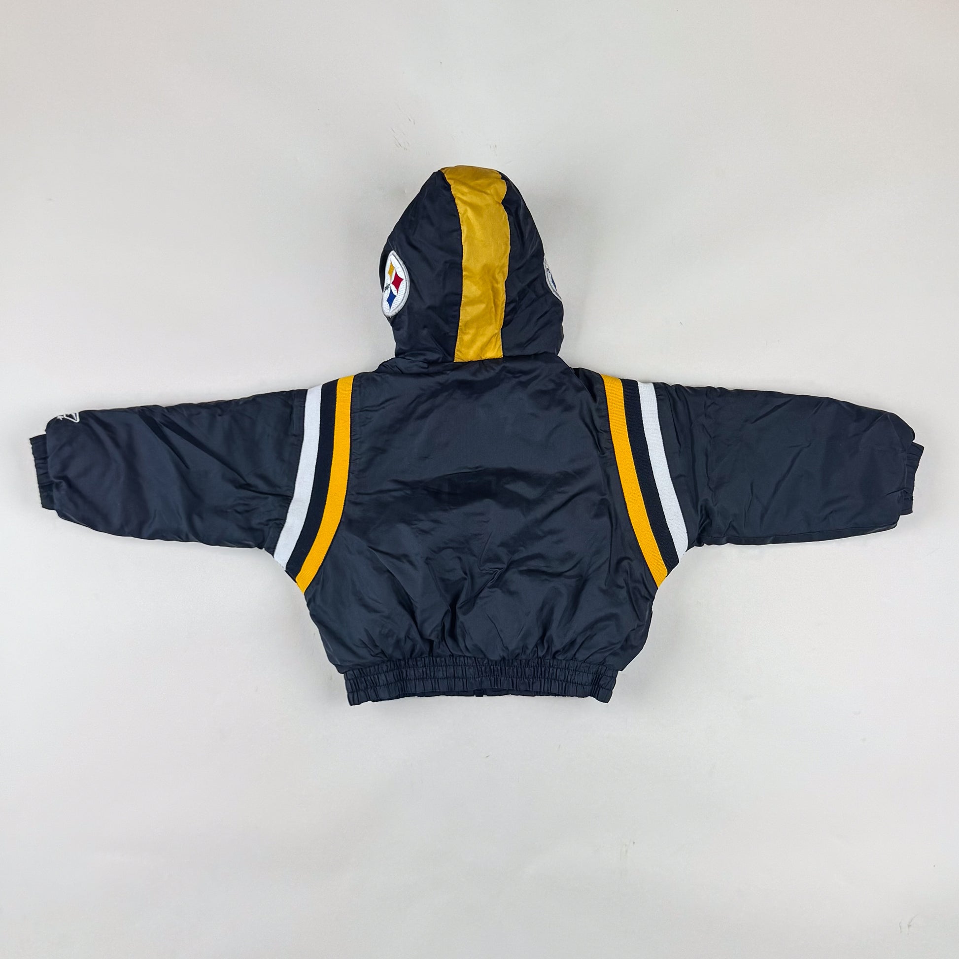 Coolest vintage NFL Pittsburgh Steelers padded jacket in size 3T, however, we believe it would be a better fit for size 92. Please see the measurement to ensure the right fit. The jacket is in great quality and condition.