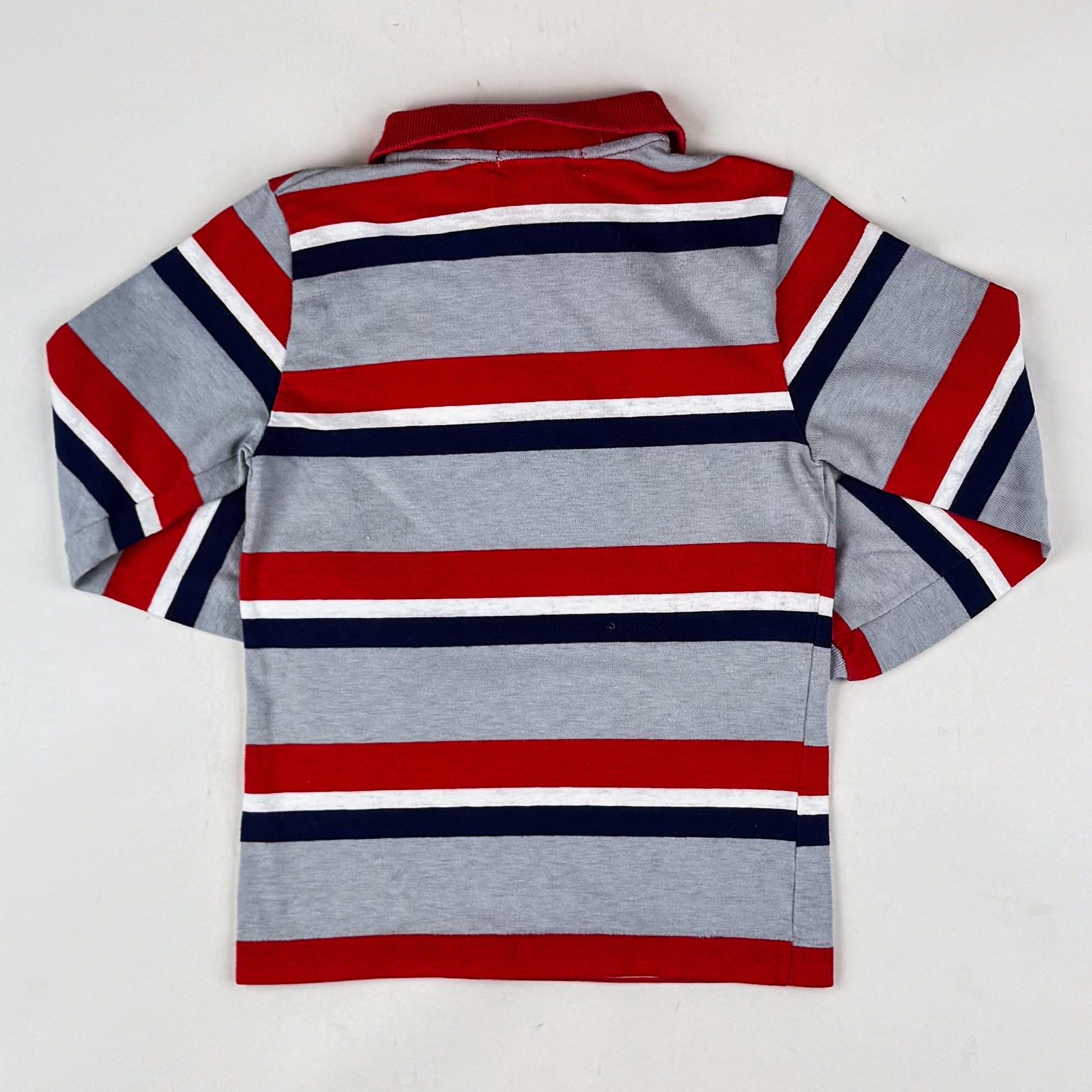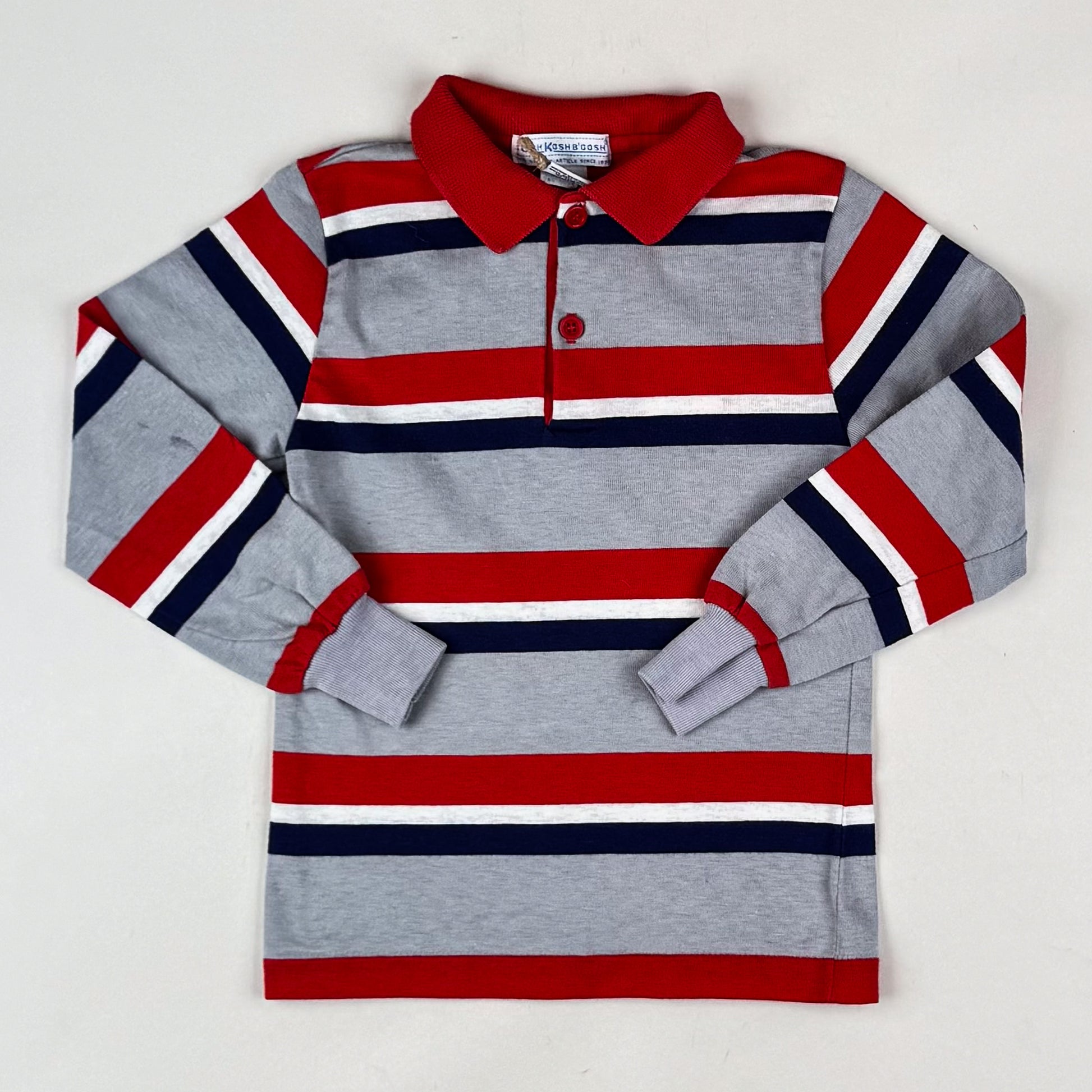 Coolest striped vintage polo from OshKosh in size 6 yrs, however, we believe it would be a better fit for size 104/110. The shirt is in great quality and condition, however, there is a faded mark on the back of the right sleeve that we have not attempted to remove. Please use the zoom function to have a better look.
